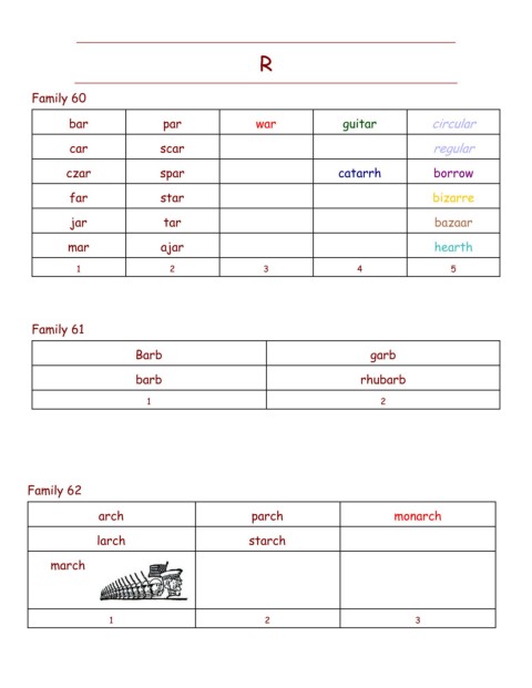 R Family 60 bar par war guitar circular car scar regular czar spar catarrh borrow far star bizarre jar tar bazaar mar ajar hearth 1 2 3 4 5 Family 61 Barb garb barb rhubarb 1 2 Family 62 arch parch monarch larch starch march ~ 1 2 3