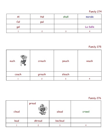 Family 274 Al Hal shall morale Cal pal gal La Salle 1 2 3 4 Family 275 ouch crouch pouch vouch couch grouch slouch 1 2 3 4 Family 276 proud cloud aloud crowd loud shroud becloud 1 2 3 4