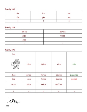 Family 188 die lie tie fie pie vie 1 2 3 Family 189 bribe scribe gibe tribe jibe 1 2 Family 190 ice nice spice vice vise dice price thrice advice paradise lice rice trice device police mice slice twice suffice 1 2 3 4 5 -238-