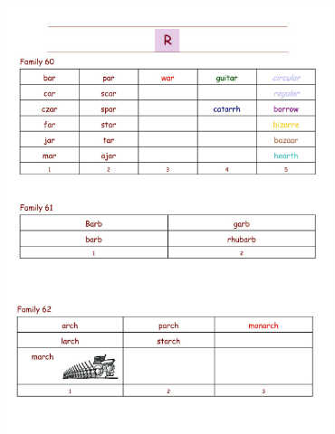 R Family 60 bar par war guitar circular car scar regular czar spar catarrh borrow far star bizarre jar tar bazaar mar ajar hearth 1 2 3 4 5 Family 61 Barb garb barb rhubarb 1 2 Family 62 arch parch monarch larch starch march ~ 1 2 3