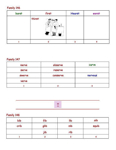 Family 146 burst first Hearst worst thirst 1 2 3 4 Family 147 nerve observe curve serve reserve swerve conserve nervous verve 1 2 3 / Family 148 bib fib lib sib crib glib nib squib jib rib 1 2 3 4