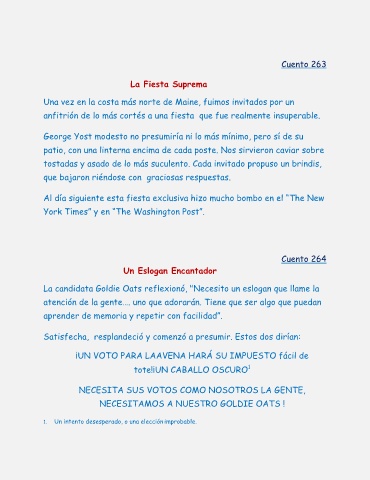 La candidata Goldie Oats reflexionó, "Necesito un eslogan que llame la