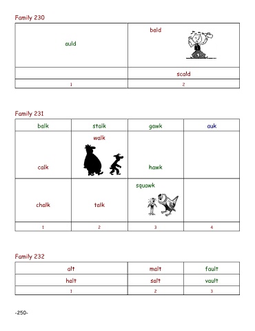 Family 230 bald auld scald 1 2 Family 231 balk stalk gawk auk walk calk hawk squawk f chalk talk 1 2 3 4 Family 232 r I 7 alt malt I fault - - halt salt vault - - 1 2 3 (_ I I _J -250-