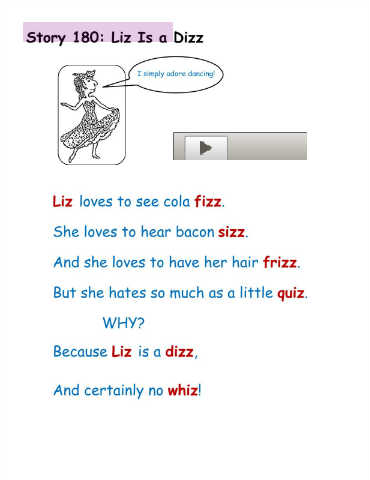 Story 180: Liz Is a Dizz I simply adore dancing! Liz loves to see cola fizz. She loves to hear bacon sizz. And she loves to have her hair frizz. But she hates so much as a little quiz. WHY? Because Liz is a dizz, And certainly no whiz!