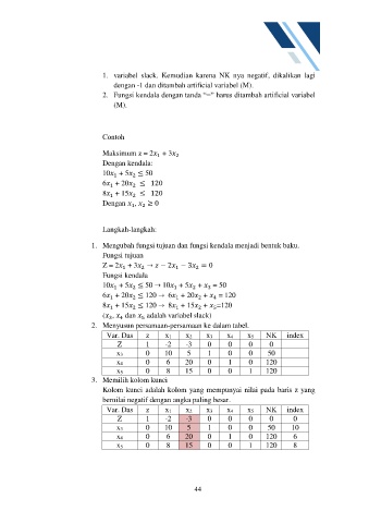 2. Fungsi kendala dengan tanda “=” harus ditambah artificial variabel