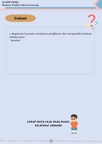 E-LKPD FISIKA Berbasis Problem Based Learning Evaluasi 4. Bagaimana kacamata membantu penglihatan dan memperbaiki kelainan refraksi mata? Jawaban: Cukup mata saja yang minus kelakuan JANGAN! 15