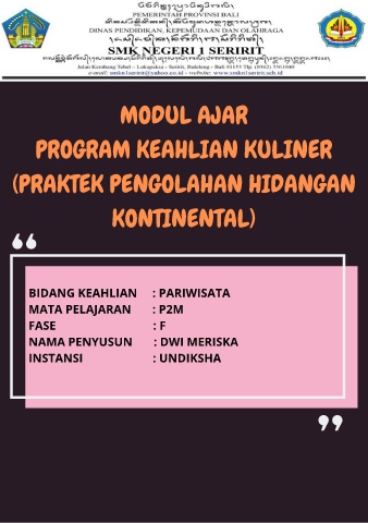 MODUL AJAR PROGRAM KEAHLIAN KULINER (PRAKTEK PENGOLAHAN HIDANGAN KONTINENTAL) BIDANG KEAHLIAN : PARIWISATA MATA PELAJARAN : P2M FASE : F NAMA PENYUSUN : DWI MERISKA INSTANSI : UNDIKSHA
