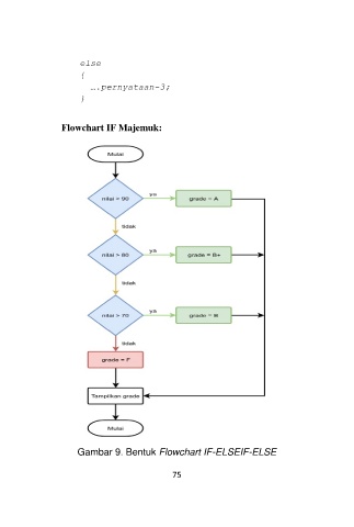 else { ….pernyataan-3; } Flowchart IF Majemuk: Gambar 9. Bentuk Flowchart IF-ELSEIF-ELSE 75