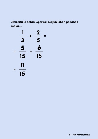 Jika ditulis dalam operasi penjumlahan pecahan maka.... 1 + 2 = 3 5 5 6 = + 15 15 11 = 15 16 | Fun Activity Modul