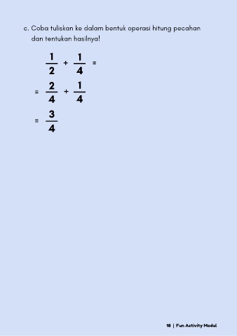 c. Coba tuliskan ke dalam bentuk operasi hitung pecahan dan tentukan hasilnya! 1 + 1 = 2 4 2 1 = + 4 4 3 = 4 18 | Fun Activity Modul