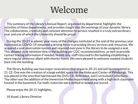 This summary of the Library’s Annual Report, organized by department, highlights the