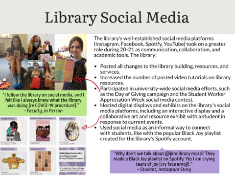 was doing [re COVID-19 procedure].” Hosted digital displays and exhibits on the library's social