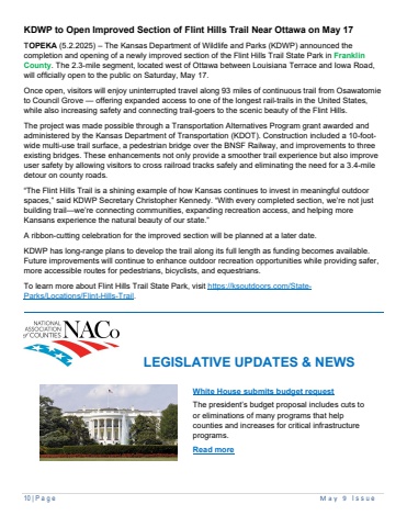 10 | Page May 9 I ssueKDWP to Open Improved Section of Flint Hills Trail Near Ottawa on May 17TOPEKA (5.2.2025) %u2013 The Kansas Department of Wildlife and Parks (KDWP) announced the completion and opening of a newly improved section of the Flint Hills Trail State Park in Franklin County. The 2.3-mile segment, located west of Ottawa between Louisiana Terrace and Iowa Road, will officially open to the public on Saturday, May 17.Once open, visitors will enjoy uninterrupted travel along 93 miles of continuous trail from Osawatomie to Council Grove %u2014 offering expanded access to one of the longest rail-trails in the United States, while also increasing safety and connecting trail-goers to the scenic beauty of the Flint Hills.The project was made possible through a Transportation Alternatives Program grant awarded and administered by the Kansas Department of Transportation (KDOT). Construction included a 10-footwide multi-use trail surface, a pedestrian bridge over the BNSF Railway, and improvements to three existing bridges. These enhancements not only provide a smoother trail experience but also improve user safety by allowing visitors to cross railroad tracks safely and eliminating the need for a 3.4-mile detour on county roads.%u201cThe Flint Hills Trail is a shining example of how Kansas continues to invest in meaningful outdoor spaces,%u201d said KDWP Secretary Christopher Kennedy. %u201cWith every completed section, we%u2019re not just building trail%u2014we%u2019re connecting communities, expanding recreation access, and helping more Kansans experience the natural beauty of our state.%u201dA ribbon-cutting celebration for the improved section will be planned at a later date.KDWP has long-range plans to develop the trail along its full length as funding becomes available. Future improvements will continue to enhance outdoor recreation opportunities while providing safer, more accessible routes for pedestrians, bicyclists, and equestrians.To learn more about Flint Hills Trail State Park, visit https://ksoutdoors.com/StateParks/Locations/Flint-Hills-Trail.LEGISLATIVE UPDATES & NEWSWhite House submits budget requestThe president%u2019s budget proposal includes cuts to or eliminations of many programs that help counties and increases for critical infrastructure programs.Read more