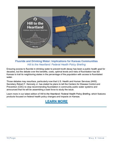 13 | Page May 9 I ssueFluoride and Drinking Water: Implications for Kansas CommunitiesHill to the Heartland: Federal Health Policy BriefingEnsuring access to fluoride in drinking water to prevent tooth decay has been a public health goal for decades, but the debate over the benefits, costs, optimal levels and risks of fluoridation has led Kansas to trail its neighboring states in the percentage of the population with access to fluoridated water.Those debates may resurface, particularly now that U.S. Health and Human Services (HHS) Secretary Robert F. Kennedy Jr. has stated he plans to tell the Centers for Disease Control and Prevention (CDC) to stop recommending fluoridation in community public water systems and announced that he will be assembling a task force to study the issue.Learn more in our latest edition of Hill to the Heartland: Federal Health Policy Briefing, which features products focused on federal health policy changes and impacts on Kansas.LEARN MORE