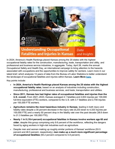 14 | Page May 9 I ssueIn 2024, America%u2019s Health Rankings placed Kansas among the 20 states with the highest occupational fatality rates for the construction, manufacturing, trade, transportation and utility, and professional and business service industries, in aggregate. Today, April 28, marks the annual Occupational Safety and Health Day, an international campaign to bring attention to the hazards associated with occupations and the opportunities to improve safety for workers. Learn more in our latest brief, which analyzes 13 years of data from the Bureau of Labor Statistics to better understand the landscape of occupational fatalities and injuries within Kansas. Learn More here.Key points include:%u2022 In 2024, America%u2019s Health Rankings placed Kansas among the 20 states with the highest occupational fatality rates, based on an analysis of industries including construction, manufacturing, professional and business services, and trade, transportation and utilities. %u2022 Since 2011, Kansas has had higher rates of occupational fatalities and injuries than the U.S. overall. From 2021%u20132023, Kansas averaged 4.1 fatalities and 2,833 injuries per 100,000 full-time equivalent (FTE) workers, compared to the U.S. with 3.7 fatalities and 2,700 injuries per 100,000 FTE workers. %u2022 Agriculture remains the most hazardous industry in Kansas, leading in both injury and fatality rates despite a 30 percent decrease in the injury rate (6,233 down to 4,333 injuries per 100,000 FTE) and a nearly 50 percent drop in the fatality rate over the past decade (38.6 down to 21.3 fatalities per 100,000 FTE). %u2022 Nearly 1 in 5 (19.4 percent) occupational fatalities in Kansas involve workers age 65 and older, despite this group comprising only 9.6 percent of the workforce, reflecting the dangers faced by aging workers in high-risk industries such as agriculture. %u2022 Despite men and women making up roughly similar portions of Kansas' workforce (53.5 percent and 46.5 percent, respectively), men make up a much more significant percentage of occupational fatalities (94.2 percent compared to 5.8 percent).