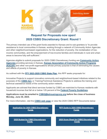 15 | Page May 9 I ssueRequest for Proposals now open!2025 CSBG Discretionary Grant: Round 1The primary intended use of the grant funds awarded to Kansas and to sub-grantees is %u201cto provide assistance to local communities in Kansas, working through a network of Community Action Agencies and other neighborhood-based organizations, for the reduction of poverty, the revitalization of lowincome communities, and the empowerment of low-income families and individuals in rural and urban areas to become fully self-sufficient.%u201d Agencies eligible to submit proposals for 2025 CSBG Discretionary funding are Community Action Agencies providing services in Kansas, Kansas Association of Community Action Programs (KACAP) and other non-profit organizations whose primary purpose is that of eliminating the causes and effects of poverty in Kansas. As outlined with the FFY 2023-2025 CSBG State Plan, this RFP seeks proposals for:Innovative Projects to support innovative community and neighborhood-based initiatives related to the purposes of the CSBG Act, or Training/Technical Assistance Projects to address the training and technical assistance needs of the community action network. Applicants are advised that direct services funded by CSBG are restricted to Kansas residents with household incomes that fall at or below 125 percent of the Federal Poverty Guidelines.Applications must be emailed to CSBG@kshousingcorp.org before the close of business Monday, June 30, 2025.For more information, visit the CSBG web page or view the 2025 CSBG RFP Documents belowApplication for 2025 CSBG Discretionary FundsRFP Guide to 2025 CSBG Discretionary Funds2025 Budget for CSBG Discretionary Funds2025 Score Sheet for CSBG Discretionary Funds