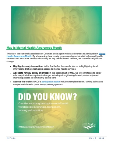 16 | Page May 9 I ssueMay is Mental Health Awareness MonthThis May, the National Association of Counties once again invites all counties to participate in Mental Health Awareness Month. By showcasing how county governments provide vital behavioral health services and resources and by advocating for key mental health reforms, we can effect significant change.%u2022 Highlight county innovation: In the first half of the month, join us in highlighting local innovations that are reshaping access to mental health services.%u2022 Advocate for key policy priorities: In the second half of May, we will shift focus to policy advocacy that drives systemic change, including strengthening federal partnerships and improving access to community-based care.%u2022 Access the toolkit: NACo%u2019s participation toolkit includes template letters, talking points and sample social media posts to support engagement.