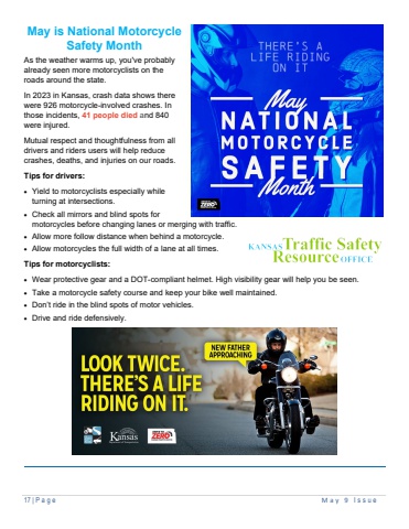 17 | Page May 9 I ssueMay is National Motorcycle Safety MonthAs the weather warms up, you've probably already seen more motorcyclists on the roads around the state.In 2023 in Kansas, crash data shows there were 926 motorcycle-involved crashes. In those incidents, 41 people died and 840 were injured.Mutual respect and thoughtfulness from all drivers and riders users will help reduce crashes, deaths, and injuries on our roads.Tips for drivers:%u2022 Yield to motorcyclists especially while turning at intersections.%u2022 Check all mirrors and blind spots for motorcycles before changing lanes or merging with traffic.%u2022 Allow more follow distance when behind a motorcycle.%u2022 Allow motorcycles the full width of a lane at all times.Tips for motorcyclists:%u2022 Wear protective gear and a DOT-compliant helmet. High visibility gear will help you be seen.%u2022 Take a motorcycle safety course and keep your bike well maintained.%u2022 Don%u2019t ride in the blind spots of motor vehicles.%u2022 Drive and ride defensively.