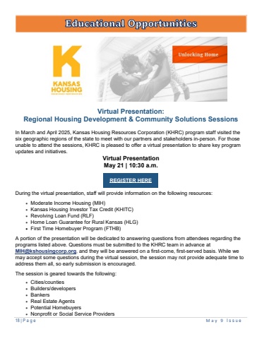 18 | Page May 9 I ssueVirtual Presentation:Regional Housing Development & Community Solutions SessionsIn March and April 2025, Kansas Housing Resources Corporation (KHRC) program staff visited the six geographic regions of the state to meet with our partners and stakeholders in-person. For those unable to attend the sessions, KHRC is pleased to offer a virtual presentation to share key program updates and initiatives.Virtual PresentationMay 21 | 10:30 a.m.During the virtual presentation, staff will provide information on the following resources:%u2022 Moderate Income Housing (MIH)%u2022 Kansas Housing Investor Tax Credit (KHITC)%u2022 Revolving Loan Fund (RLF)%u2022 Home Loan Guarantee for Rural Kansas (HLG)%u2022 First Time Homebuyer Program (FTHB)A portion of the presentation will be dedicated to answering questions from attendees regarding the programs listed above. Questions must be submitted to the KHRC team in advance at MIH@kshousingcorp.org, and they will be answered on a first-come, first-served basis. While we may accept some questions during the virtual session, the session may not provide adequate time to address them all, so early submission is encouraged.The session is geared towards the following:%u2022 Cities/counties%u2022 Builders/developers%u2022 Bankers%u2022 Real Estate Agents%u2022 Potential Homebuyers%u2022 Nonprofit or Social Service ProvidersREGISTER HERE