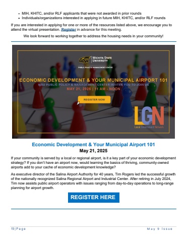 19 | Page May 9 I ssue%u2022 MIH, KHITC, and/or RLF applicants that were not awarded in prior rounds%u2022 Individuals/organizations interested in applying in future MIH, KHITC, and/or RLF roundsIf you are interested in applying for one or more of the resources listed above, we encourage you to attend the virtual presentation. Register in advance for this meeting.We look forward to working together to address the housing needs in your community!Economic Development & Your Municipal Airport 101May 21, 2025If your community is served by a local or regional airport, is it a key part of your economic development strategy? If you don%u2019t have an airport now, would learning the basics of thriving, community-owned airports add to your cache of economic development knowledge? As executive director of the Salina Airport Authority for 40 years, Tim Rogers led the successful growth of the nationally recognized Salina Regional Airport and Industrial Center. After retiring in July 2024, Tim now assists public airport operators with issues ranging from day-to-day operations to long-range planning for airport growth.REGISTER HERE
