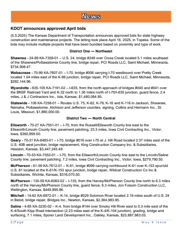 2 | Page May 9 I ssueKDOT announces approved April bids(5.5.2025) The Kansas Department of Transportation announces approved bids for state highway construction and maintenance projects. The letting took place April 16, 2025, in Topeka. Some of the bids may include multiple projects that have been bundled based on proximity and type of work.District One %u2014 NortheastShawnee - 24-89 KA-7359-01 %u2013 U.S. 24, bridge #248 over Cross Creek located 5.1 miles southeast of the Shawnee/Pottawatomie County line, bridge repair, PCI Roads LLC, Saint Michael, Minnesota, $734,908.47.Wabaunsee - 70-99 KA-7607-01 %u2013 I-70, bridge #006 carrying I-70 westbound over Pretty Creek located 1.04 miles east of the K-99 junction, bridge repair, PCI Roads LLC, Saint Michael, Minnesota, $292,144.96.Wyandotte - 635-105 KA-7191-02 %u2013 I-635, from the north approach of bridges #040 and #041 over the BNSF Railroad Yard and K-32 north to 1.36 miles north of I-70/I-635 junction, guard fence, 2.4 miles, J & J Contractors Inc., Iola, Kansas, $1,480,084.85.Statewide - 106 KA-7258-01 %u2013 Routes U.S. 75, K-62, K-79, K-16 and K-116 in Jackson, Shawnee, Nemaha, Pottawatomie, Atchison and Jefferson counties, signing, Collins and Hermann Inc., St. Louis, Missouri, $1,880,000.00.District Two %u2014 North CentralEllsworth - 70-27 KA-7551-01 %u2013 I-70, from the Russell/Ellsworth County line east to the Ellsworth/Lincoln County line, pavement patching, 23.3 miles, Iowa Civil Contracting Inc., Victor, Iowa, $360,959.50.Geary - 70-31 KA-6483-01 %u2013 I-70, bridge #016 over I-70 at J. Hill Road located 2.37 miles east of the U.S. 40B west junction, bridge replacement, King Construction Company Inc. & Subsidiaries, Hesston, Kansas, $3,447,245.49.Lincoln - 70-53 KA-7552-01 %u2013 I-70, from the Ellsworth/Lincoln County line east to the Lincoln/Saline County line, pavement patching, 7.2 miles, Iowa Civil Contracting Inc., Victor, Iowa, $279,790.50.McPherson - 61-59 KA-7612-01 %u2013 K-61, bridge #099 carrying northbound K-61 over K-153 spur/old U.S. 81 located at the K-61/K-153 spur junction, bridge repair, Wildcat Construction Co Inc & Subsidiaries, Wichita, Kansas, $316,070.50.McPherson - 135-59 KA-6063-02 %u2013 I-135, from the Harvey/McPherson County line north to 6.3 miles north of the Harvey/McPherson County line, guard fence, 6.3 miles, Jon Fulsom Construction LLC, Wellington, Kansas, $449,895.86.Mitchell - 14-62 KA-6972-01 %u2013 K-14, bridge #029 Solomon River located 2.19 miles south of U.S. 24 in Beloit, bridge repair, Bridges Inc., Newton, Kansas, $2,384,983.95.Saline - 4-85 KA-3230-02 %u2013 K-4, from bridge #144 over Smoky Hill River east to 0.3 mile east of the K-4/South Kipp Road intersection (2.23 miles east of the K-4/K-104 junction), grading, bridge and surfacing, 7.1 miles, Sporer Land Development Inc., Oakley, Kansas, $23,887,983.03.