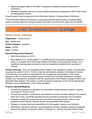 33 | Page May 9 I ssue%u2022 Migrating program data for the Public Transparency Database (Kansas Department of Commerce)%u2022 Statewide integrated data hub for social insights addressing homelessness (WSU Public Policy and Management Center)All grant awards must be approved by the Information Network of Kansas Board of Directors.**The Information Network of Kansas is a quasi-governmental entity focused on enabling digital access to Kansas state and local government information and services for public use and benefit.Finney County %u2013 AppraiserOrganization: Finney CountyCity: Garden CityPrimary Category: AppraisalSalary: $ DOQType: Full-timeEducation/Experience Required:%u2022 High school diploma or G.E.D.%u2022 State Statute K.S.A.19-430 states (1) A certified general real property appraiser pursuant to article 41 of chapter 58 of the Kansas Statutes Annotated, and amendments thereto; (2) a registered mass appraiser pursuant to rules and regulations adopted by the secretary of revenue.Position Summary: This is an appointed position subject to the regulations, policies, and education requirements outlined in K.S.A. 19-430. Under the administrative direction of the Board of County Commissioners, this position is responsible for the management and operation of the County Appraiser's office to ensure that property values are fairly and accurately established, reviewed, updated, and maintained in accordance with the requirements of the Property Valuation Division and applicable State statutes. This position is under the general supervision of the County Administrator, Assistant County Administrator, and/or his/her designee.Property Appraisal/Mapping.%u2022 Oversee and complete the appraisal of all real estate, tangible personal property, mapping, and oil/gas for Finney County.%u2022 Oversee the collection, maintenance, and retention of records and data relating to the property within the County; coordinate appraisal services provided by employees and consultants.%u2022 Determine property tax assessment and verify that all appraisal records conform to the guidelines of the Property Valuation Division and applicable State statutes.%u2022 Prepares or reviews plans and specifications for the supplies, services, and contracts.%u2022 Administers, represents, defends, and participates in property valuation protests and appeals. Assist in the defense of appraisal values in hearings (i.e., informal, Payment Under Protest,