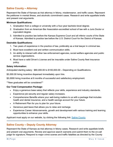 36 | Page May 9 I ssueSaline County %u2013 AttorneyRepresent the State of Kansas as trial attorney in felony, misdemeanor, and traffic cases. Represent the petitioner in mental illness, and alcoholic commitment cases. Research and write appellate briefs and present oral arguments.Minimum Qualifications:1. Graduation from a college or university with a four-year bachelor-level degree.2. Graduation from an American Bar Association-accredited school of law with a Juris Doctor or equivalent degree.3. Admitted to practice law before the Kansas Supreme Court and all inferior courts of the State of Kansas. Admitted to practice law before the U.S. District Court for the District of Kansas.Desirable Qualifications:1. Two years of experience in the practice of law, preferably as a trial lawyer in criminal law.2. Must have excellent oral and written communication skills.3. An ability to interact with other law enforcement agencies, social welfare agencies and public service organizations.4. Must have a valid Driver%u2019s License and be insurable under Saline County fleet insurance policy.Salary Information:Anticipated starting salary: $80,000.00 to $100,000.00 %u2013 Depending on Qualifications.$5,000.00 hiring incentive dispersed immediately upon hire.$5,0000 hiring incentive at 6 months of successful and satisfactory employment.**New graduates will be considered**Our Total Compensation Package:%u2022 Enjoy a generous base salary that reflects your skills, experience and industry standards.%u2022 Experience job security and regular salary increases.%u2022 Comprehensive Benefits where your well-being matters to us with a package that includes health and dental insurance, and a health savings account for your future.%u2022 A Retirement Plan for you to plan for your future.%u2022 Generous paid leave that allows you to relax and recharge.%u2022 Experience Career Advancements, growth and development with various training and learning opportunities to enhance your skills.Applicant must apply on our website, by clicking the following link: Saline CountySaline County %u2013 Deputy County AttorneyRepresent the State of Kansas as trial attorney in felony cases. Research and write appellate briefs and present oral arguments. Review and approve search warrants and submit them to the on-call judge for signature; Respond to major crime scenes and traffic fatalities as directed by the County