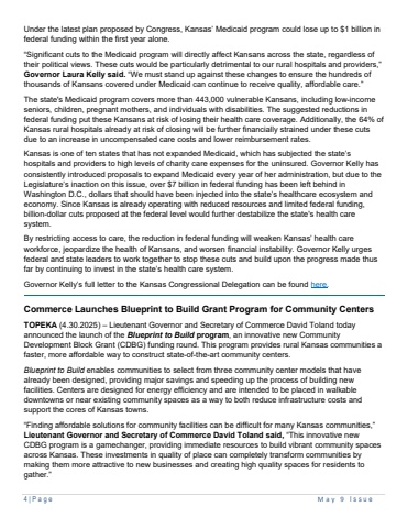 4 | Page May 9 I ssueUnder the latest plan proposed by Congress, Kansas%u2019 Medicaid program could lose up to $1 billion in federal funding within the first year alone.%u201cSignificant cuts to the Medicaid program will directly affect Kansans across the state, regardless of their political views. These cuts would be particularly detrimental to our rural hospitals and providers,%u201d Governor Laura Kelly said. %u201cWe must stand up against these changes to ensure the hundreds of thousands of Kansans covered under Medicaid can continue to receive quality, affordable care.%u201dThe state's Medicaid program covers more than 443,000 vulnerable Kansans, including low-income seniors, children, pregnant mothers, and individuals with disabilities. The suggested reductions in federal funding put these Kansans at risk of losing their health care coverage. Additionally, the 64% of Kansas rural hospitals already at risk of closing will be further financially strained under these cuts due to an increase in uncompensated care costs and lower reimbursement rates.Kansas is one of ten states that has not expanded Medicaid, which has subjected the state%u2019s hospitals and providers to high levels of charity care expenses for the uninsured. Governor Kelly has consistently introduced proposals to expand Medicaid every year of her administration, but due to the Legislature%u2019s inaction on this issue, over $7 billion in federal funding has been left behind in Washington D.C., dollars that should have been injected into the state%u2019s healthcare ecosystem and economy. Since Kansas is already operating with reduced resources and limited federal funding, billion-dollar cuts proposed at the federal level would further destabilize the state's health care system.By restricting access to care, the reduction in federal funding will weaken Kansas%u2019 health care workforce, jeopardize the health of Kansans, and worsen financial instability. Governor Kelly urges federal and state leaders to work together to stop these cuts and build upon the progress made thus far by continuing to invest in the state%u2019s health care system.Governor Kelly%u2019s full letter to the Kansas Congressional Delegation can be found here.Commerce Launches Blueprint to Build Grant Program for Community CentersTOPEKA (4.30.2025) %u2013 Lieutenant Governor and Secretary of Commerce David Toland today announced the launch of the Blueprint to Build program, an innovative new Community Development Block Grant (CDBG) funding round. This program provides rural Kansas communities a faster, more affordable way to construct state-of-the-art community centers.Blueprint to Build enables communities to select from three community center models that have already been designed, providing major savings and speeding up the process of building new facilities. Centers are designed for energy efficiency and are intended to be placed in walkable downtowns or near existing community spaces as a way to both reduce infrastructure costs and support the cores of Kansas towns.%u201cFinding affordable solutions for community facilities can be difficult for many Kansas communities,%u201dLieutenant Governor and Secretary of Commerce David Toland said, %u201cThis innovative new CDBG program is a gamechanger, providing immediate resources to build vibrant community spaces across Kansas. These investments in quality of place can completely transform communities by making them more attractive to new businesses and creating high quality spaces for residents to gather.%u201d