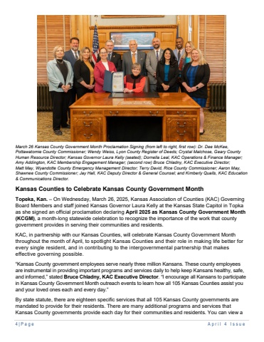 4 | Page April 4 I ssueMarch 26 Kansas County Government Month Proclamation Signing (from left to right, first row): Dr. Dee McKee, Pottawatomie County Commissioner; Wendy Weiss, Lyon County Register of Deeds; Crystal Malchose, Geary County Human Resource Director; Kansas Governor Laura Kelly (seated); Dornella Leal, KAC Operations & Finance Manager; Amy Addington, KAC Membership Engagement Manager; (second row) Bruce Chladny, KAC Executive Director; Matt May, Wyandotte County Emergency Management Director; Terry David, Rice County Commissioner; Aaron May, Shawnee County Commissioner; Jay Hall, KAC Deputy Director & General Counsel; and Kimberly Qualls, KAC Education & Communications Director.Kansas Counties to Celebrate Kansas County Government MonthTopeka, Kan. %u2013 On Wednesday, March 26, 2025, Kansas Association of Counties (KAC) Governing Board Members and staff joined Kansas Governor Laura Kelly at the Kansas State Capitol in Topka as she signed an official proclamation declaring April 2025 as Kansas County Government Month (KCGM), a month-long statewide celebration to recognize the importance of the work that county government provides in serving their communities and residents.KAC, in partnership with our Kansas Counties, will celebrate Kansas County Government Month throughout the month of April, to spotlight Kansas Counties and their role in making life better for every single resident, and in contributing to the intergovernmental partnership that makes effective governing possible.%u201cKansas County government employees serve nearly three million Kansans. These county employees are instrumental in providing important programs and services daily to help keep Kansans healthy, safe, and informed,%u201d stated Bruce Chladny, KAC Executive Director. %u201cI encourage all Kansans to participate in Kansas County Government Month outreach events to learn how all 105 Kansas Counties assist you and your loved ones each and every day.%u201dBy state statute, there are eighteen specific services that all 105 Kansas County governments are mandated to provide for their residents. There are many additional programs and services that Kansas County governments provide each day for their communities and residents. You can view a