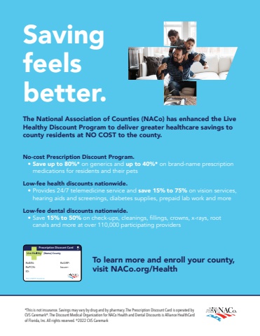 No-cost Prescription Discount Program.%u2022 Save up to 80%* on generics and up to 40%* on brand-name prescriptionmedications for residents and their petsLow-fee health discounts nationwide.%u2022 Provides 24/7 telemedicine service and save 15% to 75% on vision services,hearing aids and screenings, diabetes supplies, prepaid lab work and moreLow-fee dental discounts nationwide.%u2022 Save 15% to 50% on check-ups, cleanings, fillings, crowns, x-rays, rootcanals and more at over 110,000 participating providers*This is not insurance. Savings may vary by drug and by pharmacy. The Prescription Discount Card is operated by CVS Caremark%u00ae. The Discount Medical Organization for NACo Health and Dental Discounts is Alliance HealthCard of Florida, Inc. All rights reserved. %u00ae2022 CVS CaremarkTo learn more and enroll your county, visit NACo.org/HealthCORE CAMPAIGN ELEMENTSPrimary paletteSecondary palette1CONFIDENTIALANDPROPRIETARYSaving feels better.Avenir 95 BlackAvenir 85 HeavyAvenir 45 BookAvenir Next Condensed RePrescription Discount CardRxBIN: RxGRP:RxPCN: Issuer: ID:This is NOT insurance.[Name] CountyPMS 37426 / 0 / 73 / 32197 / 220 / 110PMS 34543.5 / 0 / 42 / 0144 / 213 / 172PMS 12350 / 29 / 85 / 1249 / 184 / 63PMS 35696 / 27 / 100 / 150 / 121 / 52PMS 281100 / 93 / 33 / 3229 / 39 / 88PMS 299572 / 16 / 0 / 06 / 167 / 224The National Association of Counties (NACo) has enhanced the Live Healthy Discount Program to deliver greater healthcare savings to county residents at NO COST to the county.Saving feels better.