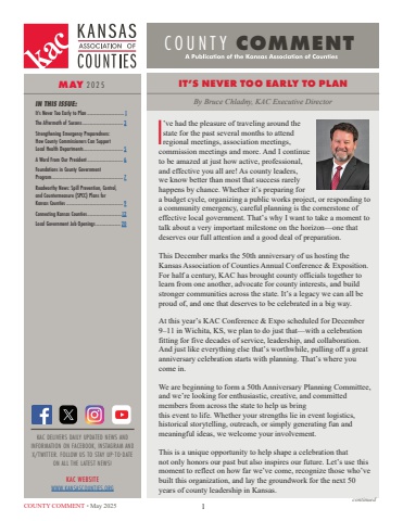 KAC DELIVERS DAILY UPDATED NEWS AND INFORMATION ON FACEBOOK, INSTAGRAM AND X/TWITTER. FOLLOW US TO STAY UP-TO-DATE ON ALL THE LATEST NEWS!KAC WEBSITEWWW.KANSASCOUNTIES.ORGMAY 2025IN THIS ISSUE:It%u2019s Never Too Early to Plan.............................. 1The Aftermath of Success.................................3Strengthening Emergency Preparedness: How County Commissioners Can Support Local Health Departments................................5A Word From Our President .............................6Foundations in County Government Program..........................................................7Roadworthy News: Spill Prevention, Control, and Countermeasure (SPCC) Plans for Kansas Counties ..............................................9Connecting Kansas Counties............................12Local Government Job Openings....................20By Bruce Chladny, KAC Executive DirectorIT%u2019S NEVER TOO EARLY TO PLANI%u2019ve had the pleasure of traveling around the state for the past several months to attend regional meetings, association meetings, commission meetings and more. And I continue to be amazed at just how active, professional, and effective you all are! As county leaders, we know better than most that success rarely happens by chance. Whether it%u2019s preparing for a budget cycle, organizing a public works project, or responding to a community emergency, careful planning is the cornerstone of effective local government. That%u2019s why I want to take a moment to talk about a very important milestone on the horizon%u2014one that deserves our full attention and a good deal of preparation.This December marks the 50th anniversary of us hosting the Kansas Association of Counties Annual Conference & Exposition. For half a century, KAC has brought county officials together to learn from one another, advocate for county interests, and build stronger communities across the state. It%u2019s a legacy we can all be proud of, and one that deserves to be celebrated in a big way.At this year%u2019s KAC Conference & Expo scheduled for December 9%u201311 in Wichita, KS, we plan to do just that%u2014with a celebration fitting for five decades of service, leadership, and collaboration. And just like everything else that%u2019s worthwhile, pulling off a great anniversary celebration starts with planning. That%u2019s where you come in.We are beginning to form a 50th Anniversary Planning Committee, and we%u2019re looking for enthusiastic, creative, and committed members from across the state to help us bring this event to life. Whether your strengths lie in event logistics, historical storytelling, outreach, or simply generating fun and meaningful ideas, we welcome your involvement.This is a unique opportunity to help shape a celebration that not only honors our past but also inspires our future. Let%u2019s use this moment to reflect on how far we%u2019ve come, recognize those who%u2019ve built this organization, and lay the groundwork for the next 50 years of county leadership in Kansas.COUNTY COMMENT %u2022 May 2025 1continuedCOUNTY COMMENT
