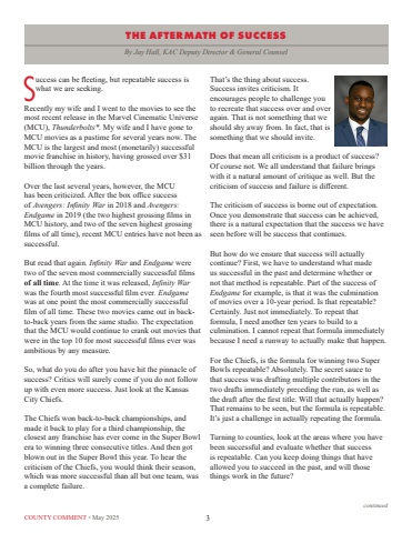 COUNTY COMMENT %u2022 May 2025 3continuedTHE AFTERMATH OF SUCCESSBy Jay Hall, KAC Deputy Director & General CounselSuccess can be fleeting, but repeatable success is what we are seeking.Recently my wife and I went to the movies to see the most recent release in the Marvel Cinematic Universe (MCU), Thunderbolts*. My wife and I have gone to MCU movies as a pastime for several years now. The MCU is the largest and most (monetarily) successful movie franchise in history, having grossed over $31 billion through the years.Over the last several years, however, the MCU has been criticized. After the box office success of Avengers: Infinity War in 2018 and Avengers: Endgame in 2019 (the two highest grossing films in MCU history, and two of the seven highest grossing films of all time), recent MCU entries have not been as successful.But read that again. Infinity War and Endgame were two of the seven most commercially successful films of all time. At the time it was released, Infinity War was the fourth most successful film ever. Endgamewas at one point the most commercially successful film of all time. These two movies came out in backto-back years from the same studio. The expectation that the MCU would continue to crank out movies that were in the top 10 for most successful films ever was ambitious by any measure.So, what do you do after you have hit the pinnacle of success? Critics will surely come if you do not follow up with even more success. Just look at the Kansas City Chiefs.The Chiefs won back-to-back championships, and made it back to play for a third championship, the closest any franchise has ever come in the Super Bowl era to winning three consecutive titles. And then got blown out in the Super Bowl this year. To hear the criticism of the Chiefs, you would think their season, which was more successful than all but one team, was a complete failure. That%u2019s the thing about success. Success invites criticism. It encourages people to challenge you to recreate that success over and over again. That is not something that we should shy away from. In fact, that is something that we should invite. Does that mean all criticism is a product of success? Of course not. We all understand that failure brings with it a natural amount of critique as well. But the criticism of success and failure is different. The criticism of success is borne out of expectation. Once you demonstrate that success can be achieved, there is a natural expectation that the success we have seen before will be success that continues. But how do we ensure that success will actually continue? First, we have to understand what made us successful in the past and determine whether or not that method is repeatable. Part of the success of Endgame for example, is that it was the culmination of movies over a 10-year period. Is that repeatable? Certainly. Just not immediately. To repeat that formula, I need another ten years to build to a culmination. I cannot repeat that formula immediately because I need a runway to actually make that happen.For the Chiefs, is the formula for winning two Super Bowls repeatable? Absolutely. The secret sauce to that success was drafting multiple contributors in the two drafts immediately preceding the run, as well as the draft after the first title. Will that actually happen? That remains to be seen, but the formula is repeatable. It%u2019s just a challenge in actually repeating the formula.Turning to counties, look at the areas where you have been successful and evaluate whether that success is repeatable. Can you keep doing things that have allowed you to succeed in the past, and will those things work in the future?