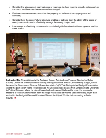 COUNTY COMMENT %u2022 May 2025 8%u2022%u0009 Consider the adequacy of cash balances or reserves, i.e. how much is enough, not enough, or too much, and how cash balances can be managed;%u2022%u0009 Evaluate revenue sources other than the property tax to finance county programs and services;%u2022%u0009 Consider how the county%u2019s fund structure enables or detracts from the ability of the board of county commissioners to effectively manage the county budget; and%u2022%u0009 Learn ways to effectively communicate county budget information to citizens, groups, and the news media.Instructor Bio: Ryan Adkison is the Assistant County Administrator/Finance Director for Butler County. One of his primary duties is crafting the organization%u2019s annual CIP/operating budget, which has won the Government Finance Officers Association%u2019s (GFOA) Distinguished Budget Presentation Award the past seven years. Ryan received his undergraduate degree from Emporia State University in Political Science, where he played basketball and married his beautiful bride. He received a Master%u2019s of Public Administration from the Hugo Wall School at Wichita State University. Ryan then worked in the Budget Office and Pension Office at the City of Wichita before moving to Butler County. n