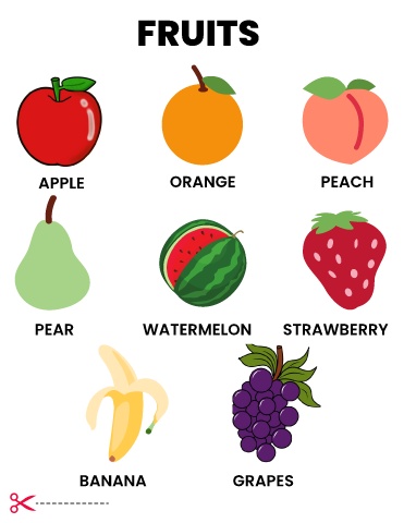 FRUITS APPLE ORANGE PEACH PEAR WATERMELON STRAWBERRY BANANA GRAPES