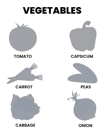 VEGETABLES TOMATO CAPSICUM CARROT PEAS CABBAGE ONION