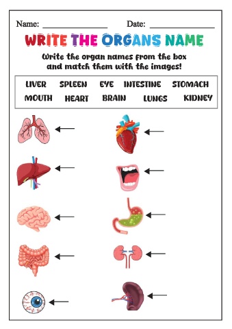 Name: Date: WRITE THE ORGANS NAME Write the organ names from the box and match them with the images! LIVER SPLEEN EYE INTESTINE STOMACH MOUTH HEART BRAIN LUNGS KIDNEY