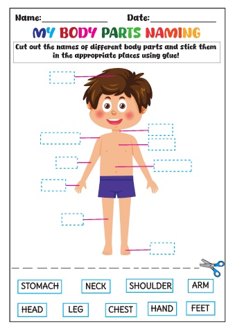 Name: Date: MY BODY PARTS NAMING Cut out the names of different body parts and stick them in the appropriate places using glue! ___ ____ ____ ___ ____ ____ ___ ___ ____ ___ __ ___ ___ ___ ___ ___ __ STOMACH NECK SHOULDER ARM HEAD LEG CHEST HAND FEET