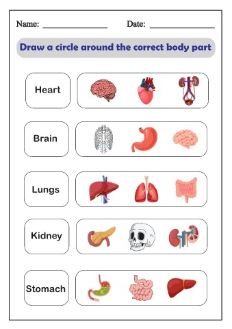 Name: Date: Draw a circle around the correct body part Heart Brain Lungs Kidney Stomach
