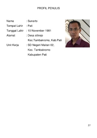 PROFIL PENULIS Nama : Sunarto Tempat Lahir : Pati Tanggal Lahir : 10 November 1981 Alamat : Desa sitirejo Kec.Tambakromo, Kab.Pati Unit Kerja : SD Negeri Maitan 02, Kec. Tambakromo Kabupaten Pati 27