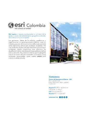 Centro de Respuesta al Cliente - CRC: T 57 + (1) 650 1575 Línea nacional 01 - 8000 - 112158 | crc@esri.co Bogotá D. C. T 57 + (1) 650 1550 Calle 90 No. 13 - 40 p. 5 T Cali 57+ (2) 489 0617 Medellín T 57 + (4) 266 6657 www.esri.co
