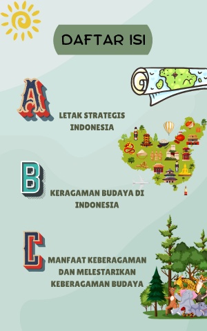 DAFTAR ISI LETAK STRATEGIS INDONESIA KERAGAMAN BUDAYA DI INDONESIA MANFAAT KEBERAGAMAN DAN MELESTARIKAN KEBERAGAMAN BUDAYA