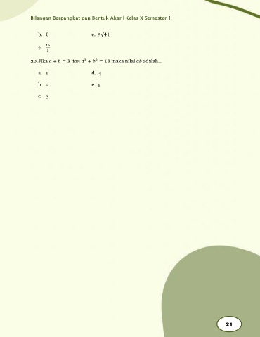 Bilangan Berpangkat dan Bentuk Akar | Kelas X Semester 1 b. 0 e. 5√41 c. 16 5 3 20. Jika + = 3 + = 18 maka nilai adalah… 3 a. 1 d. 4 b. 2 e. 5 c. 3 21