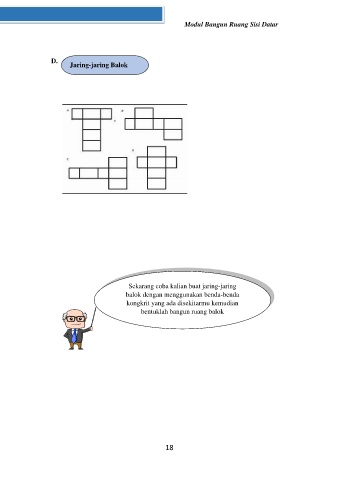 Modul Bangun Ruang Sisi Datar D. Jaring-jaring Balok Sekarang coba kalian buat jaring-jaring balok dengan menggunakan benda-benda kongkrit yang ada disekitarmu kemudian bentuklah bangun ruang balok 18