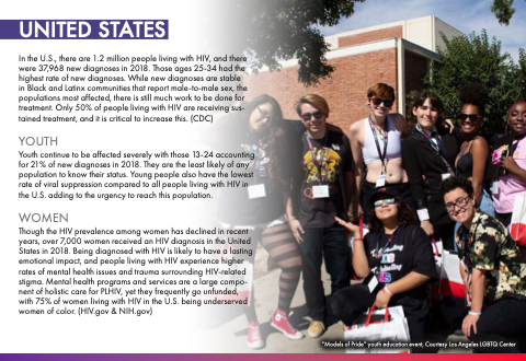 In the U.S., there are 1.2 million people living with HIV, and there were 37,968 new diagnoses in 2018. Those ages 25-34 had the highest rate of new diagnoses. While new diagnoses are stable in Black and Latinx communities that report male-to-male sex, the populations most affected, there is still much work to be done for treatment. Only 50% of people living with HIV are receiving sus- tained treatment, and it is critical to increase this. (CDC)