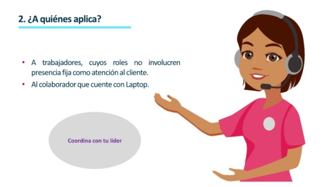 2. ¿Aquiénes aplica? • A trabajadores, cuyos roles no involucren presenciafijacomoatenciónalcliente. • AlcolaboradorquecuenteconLaptop. Coordina con tu líder