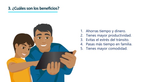 3. ¿Cuálessonlos beneficios? 1. Ahorras tiempo y dinero. 2. Tienes mayor productividad. 3. Evitas el estrés del tránsito. 4. Pasas más tiempo en familia. 5. Tienes mayor comodidad.