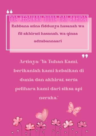 Rabbana atina fiddunya hasanah wa fil-akhirati hasanah, wa qinaa adzabannaari Artinya: "Ya Tuhan Kami, berikanlah kami kebaikan di dunia dan akhirat, serta pelihara kami dari siksa api neraka."