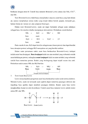 berikatan dengan atom H. Contoh basa menurut Bronsted-Lowry antara lain NH3, CO3 ,