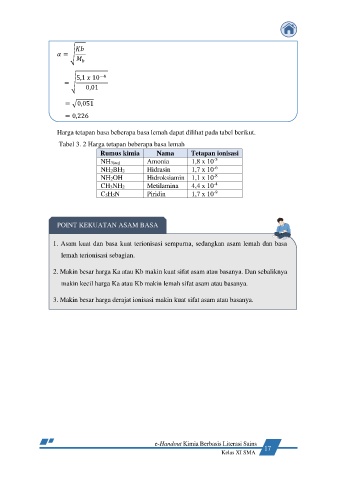 3. Makin besar harga derajat ionisasi makin kuat sifat asam atau basanya.