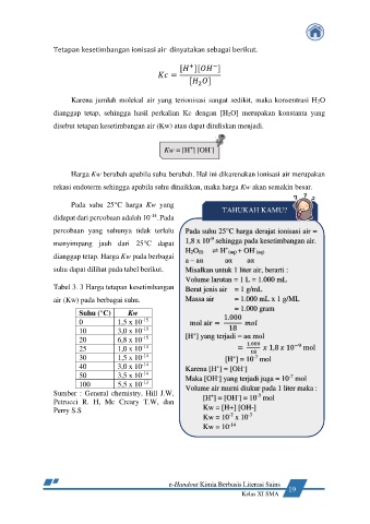 Tetapan kesetimbangan ionisasi air dinyatakan sebagai berikut.